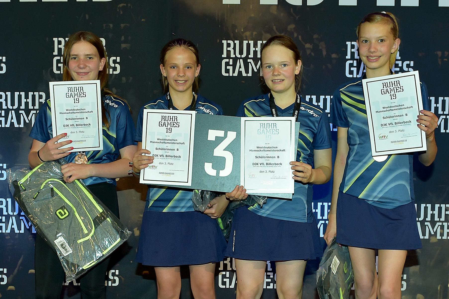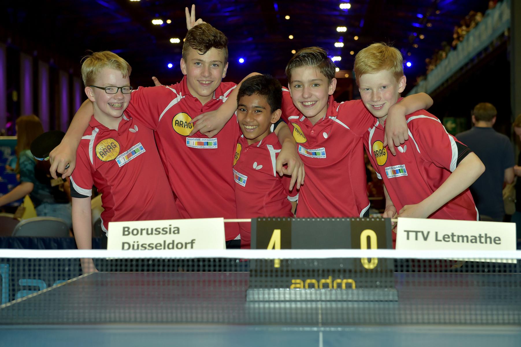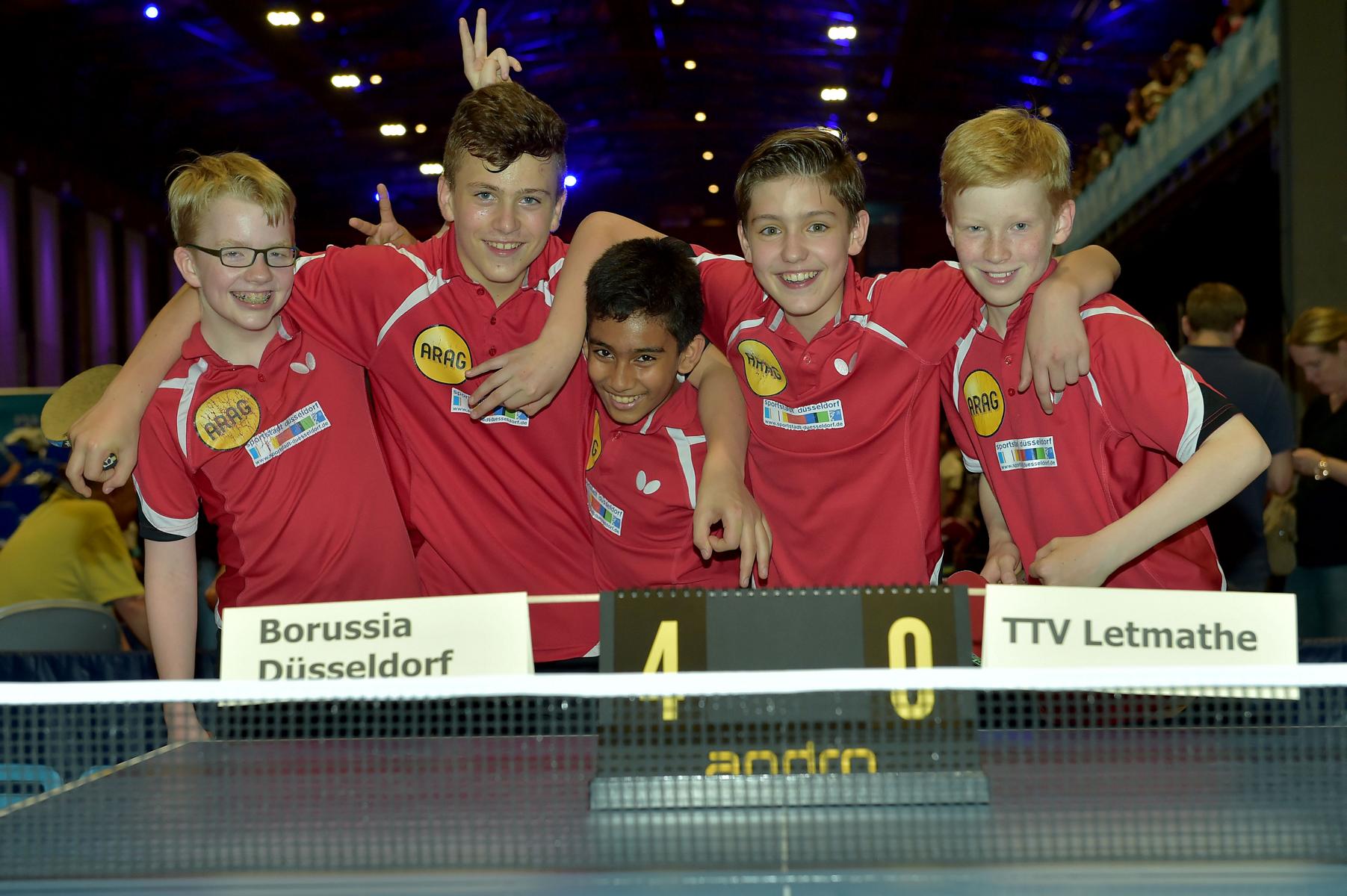Bei den Schülern B wurde Borussia Düsseldorf mit Rian Patra, Emilo Schulz und Emil Schreiber der Favoritenrolle gerecht. Im Finale ließen die Borussen dem TTV Letmathe (Arda Yenen, Sebastian Koch und Simon Benz) beim 4:0 Kantersieg nur einen einzigen Satzgewinn zu.