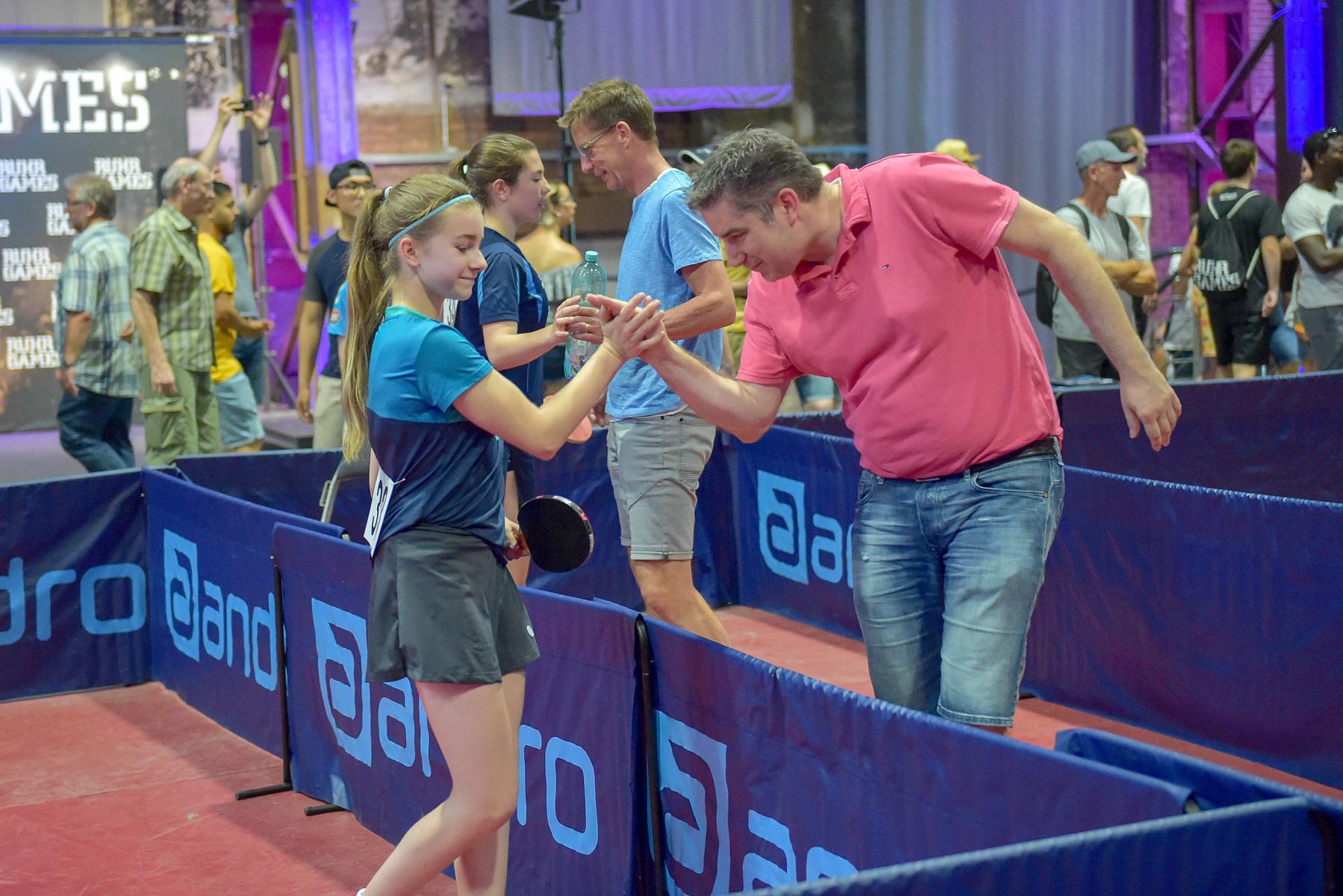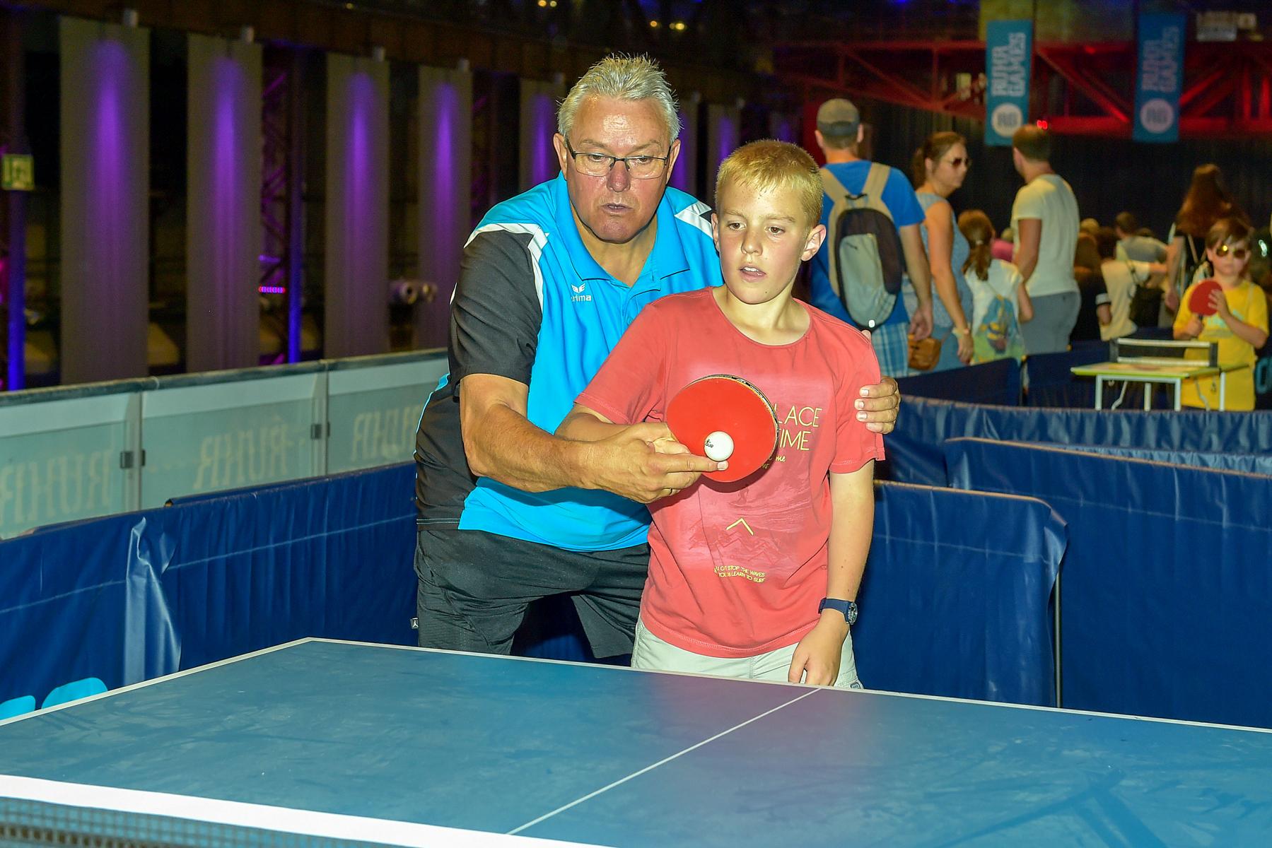 Am Wochenende fand dann das Einladungsturnier der Ruhr Games statt. Am Samstag spielten 32 Jungen und 16 Mädchen der Jahrgänge 2005 und jünger um den Titel, am Sonntag griffen dann die Jahrgänge 2003 und 2004 zum Schläger. Auch hier waren den ganzen Tag über sehr viele Zuschauer vor Ort. Der Standort war für dieses Turnier perfekt, direkt am Haupteingang standen die 8 Tische mit Gerflor-Boden. Ein Fun-Park mit Roboter, Speedmaster und mini-Tischen wurde von den Zuschauern sehr gut angenommen.