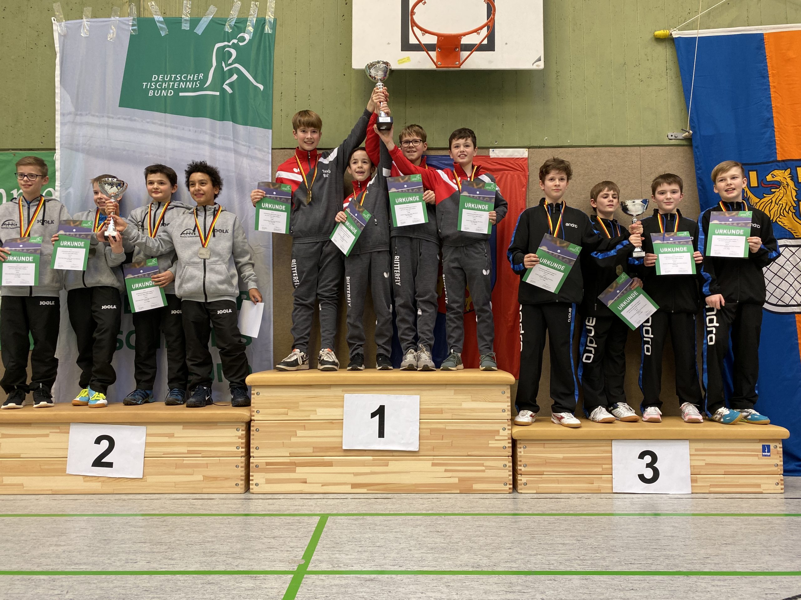 Die Jungen spielten eine tolle Vorrunde und konnten sich drei Siege gegen Thüringen (4:1), Niedersachsen (4:1) und Saarland (3:2) sichern. Somit konnte die Mannschaft mit Danielius Galatiltis (TTC Schwalbe Bergneustadt), Alexander Sahakiants (1. FC Köln), Ole Brock (LTV Lippstadt) und Bruno Moch (TTC Lövenich) in der Zwischenrunde pausieren und sich der Analyse des nächsten Gegners widmen. Hier warteten dann im Viertelfinale die Bayern, die nach jeweils zwei Siegen von Danielius und Alexander und einer Niederlage von Bruno, mit 4:1 bezwungen wurden. Am Sonntag war das hessische Team im Halbfinale ein erwartet schwerer Gegner. Alexander und Danielius mussten sich jeweils gegen die hessische Nummer eins, Tom Wienke, knapp geschlagen geben und Bruno verlor gegen Cedric Montimurro. Dementsprechend wurde das Spiel mit 2:3 verloren. Im Spiel um Platz drei gegen Niedersachsen konnten dann Danielius und Alexander wieder jeweils zweimal punkten und die Mannschaft konnte sich über einen Podestplatz und eine Bronzemedaille freuen. „Die Jungs haben eine super Veranstaltung gespielt. Alexander hat während der Veranstaltung nur ein Einzel verloren. Danielius musste nur zwei Gegnern gratulieren. Auch Ole und Bruno haben zu der Medaille beigetragen.“- so Verbandstrainerin Christine Mettner.