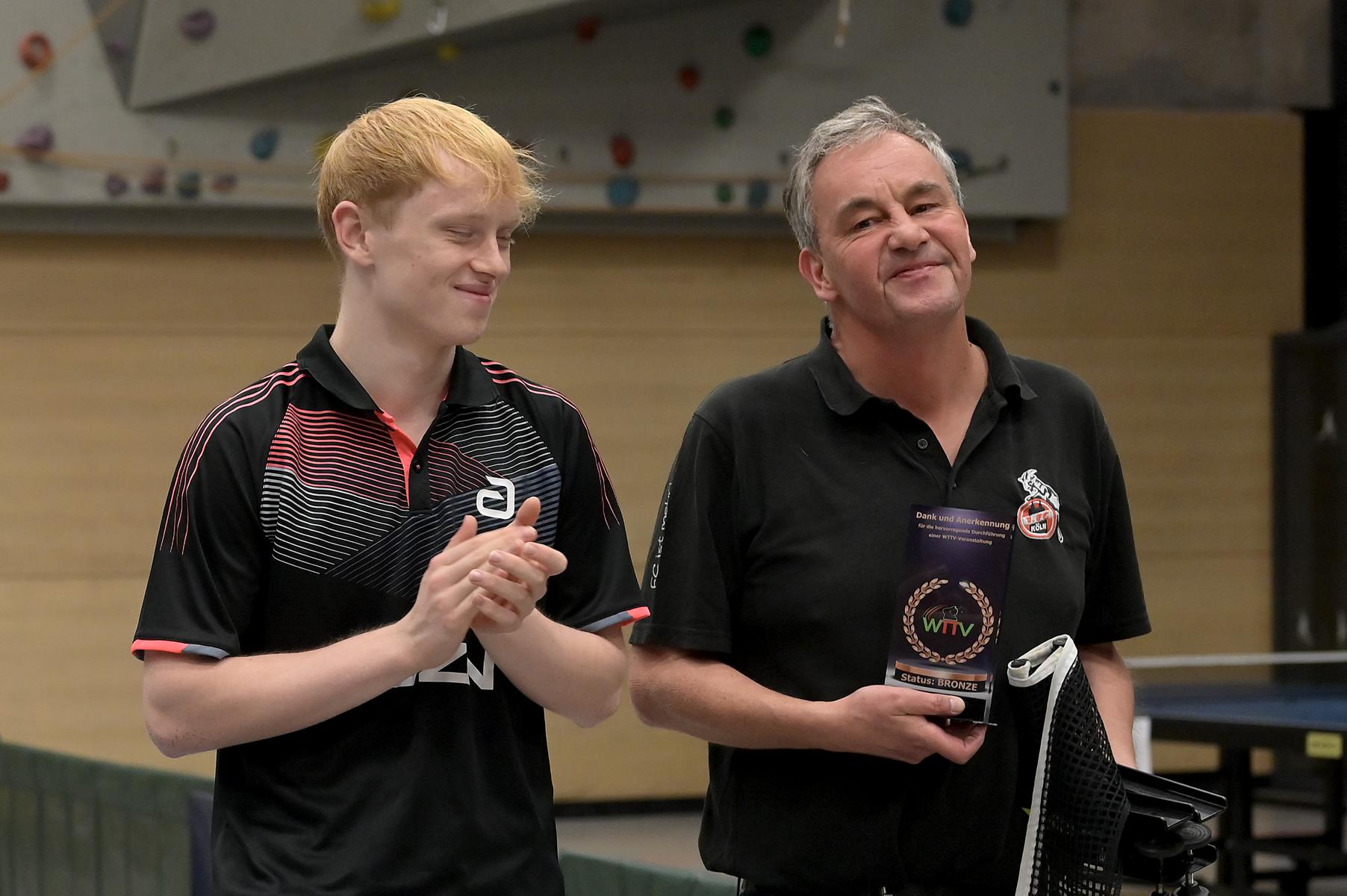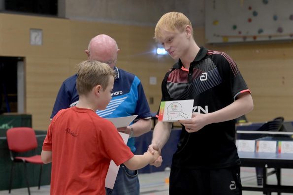 Am Ende der Veranstaltung fand die Siegerehrung statt und als Gast war Andre Bertelsmeier mit dabei. Andre, der derzeit für den 1. FC Köln spielt, hatte ein Zweitligaspiel gegen den TTC Lampertheim in der Nebenhalle.