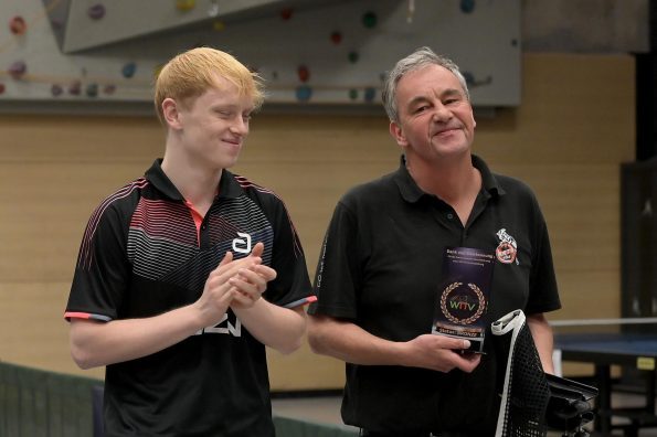 Bei den Jungen wurde zunächst in zwei 8er-Gruppen gespielt. Die Gruppensiege konnten sich jeweils ungeschlagen Mats Roland (DJK Adler Brakel) und Ron Digel (TTC indeland Jülich) sichern. Gruppenzweite wurden Nico Hughie Krosta (Burtscheider TV) und Noyan Kahraman (Spvgg. Sterkrade-Nord). In der folgenden 4er-Gruppe konnte Ron gegen Noyan gewinnen und Mats erspielte sich einen Sieg gegen Nico Hughie. Dementsprechend wurde Platz 3 unter Nico Hughie und Noyan ausgetragen. Hier setzte sich der Aachener mit 3:1 durch und konnte sich über Platz drei freuen. Das Finale der bisher zwei ungeschlagenen Spieler, Mats und Ron, war ein gutes Spiel. Nach einem hart umkämpften ersten Satz (12:10) konnte sich Mats auch Durchgang zwei sichern. Im dritten Satz kam Ron zwar nochmal zurück und gewann diesen mit 11:9. Aber im vierten Satz war dann Mats wieder der bessere Spieler und verdiente Gewinner des Spieles und der Veranstaltung.