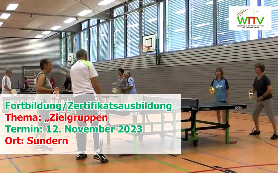 Auf Wunsch einiger Vereine bietet der WTTV am 12. November 2023 eine eintägige Fortbildung / Zertifikatsausbildung (also auch geöffnet für Interessenten ohne Trainerlizenz) zum Thema „Zielgruppen“ an. Hier können sich vor allem Personen qualifizieren, die im Verein ein zusätzliches Angebot (z.B. Hobbysport, Gesundheits- und Fitnesssport) anbieten wollen.