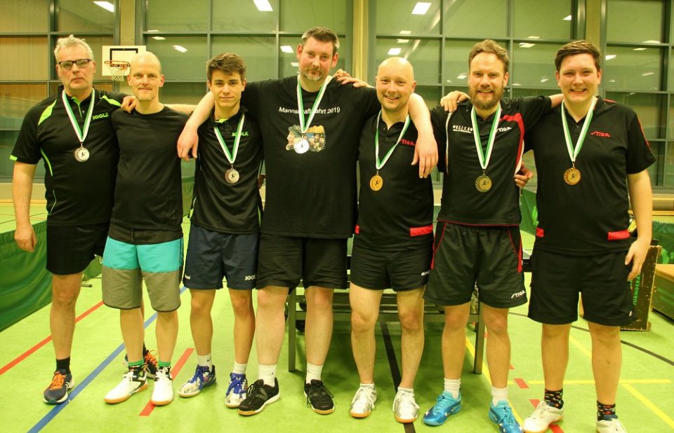 Im Finale startete der VfB Fichte Bielefeld gleich mit der 2:0 Führung: Helmut Blanke setzte sich mit 3:0 (8, 9, 8) gegen Felix Sandfort durch und Thibaud Arends holte sich mit 3:1 (5, 9, -5, 8) den Sieg gegen Matthias Stallein. Doch der SV RW Mastholte steckte nicht auf und holte sich im 3. Einzel den ersten Punkt zum 2:1 Zwischenstand – Torben Glittenberg (Mastholte) verlor zwar den ersten Satz mit 10:12, holte sich dann aber die Sätze 2, 3 und 4 (8, 10, 7) in einem spannenden abwechslungsreichen Spiel mit 3:1 gegen Marco König (Fichte). Und auch das Doppel entschieden die Mastholter Matthias Stallein/Torben Glittenberg mit 3:0 (8, 5, 6) für sich gegen Marco König/Jens Ubbelohde. Zwischenstand 2:2. Die nächsten 3 Einzel mussten die Entscheidung bringen. Helmut Blanke (Fichte) verlor den 1. Satz mit 6:11, Satz 2 ging in die Verlängerung und dann ebenfalls mit 18:16 an den Gegner Matthias Stallein, doch Blanke setzte nach und holte sich den 3. Satz mit 11:7 – doch dann mobilisierte sein Gegner nochmal alle Kraftreserven und entschied den 4. Satz mit 11:4 für sich und zum 3:1 Sieg. Mastholte führte jetzt mit 3:2. Im 5. Einzel dann Marco König (Fichte) gegen Felix Sandfort: König holte sich den 1. Satz mit 11:9, Satz 2 ging mit 8:11 an den Gegner, doch der 3. Satz erneut an König mit 11:9 und wieder holte sich der Gegner den nächsten Satz mit 10:12 – jetzt musste der 5. Satz die Entscheidung bringen – leider dann mit 11:7 für den Gegner.
