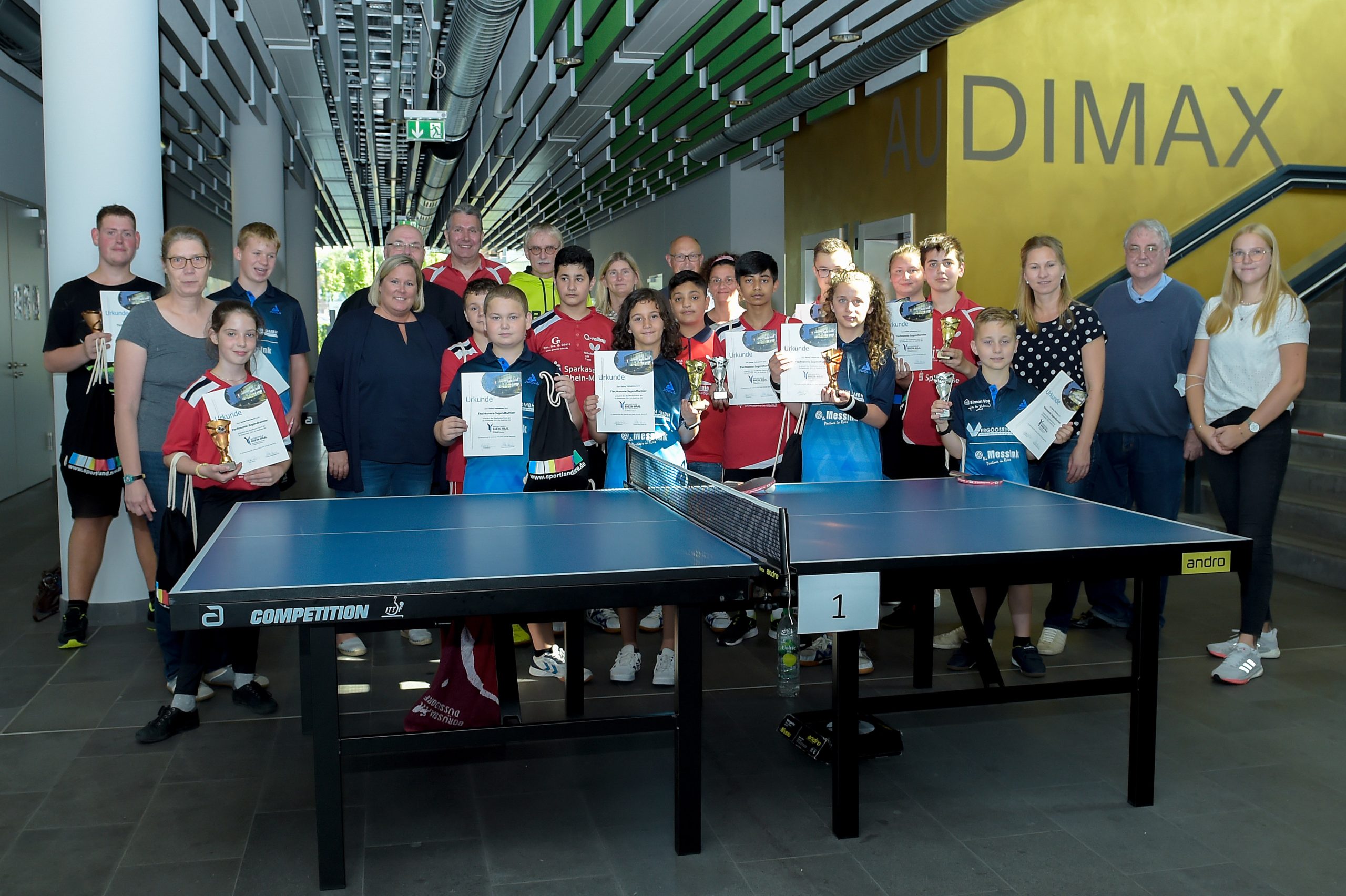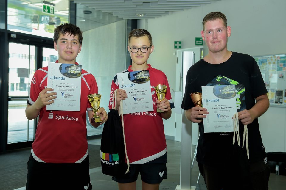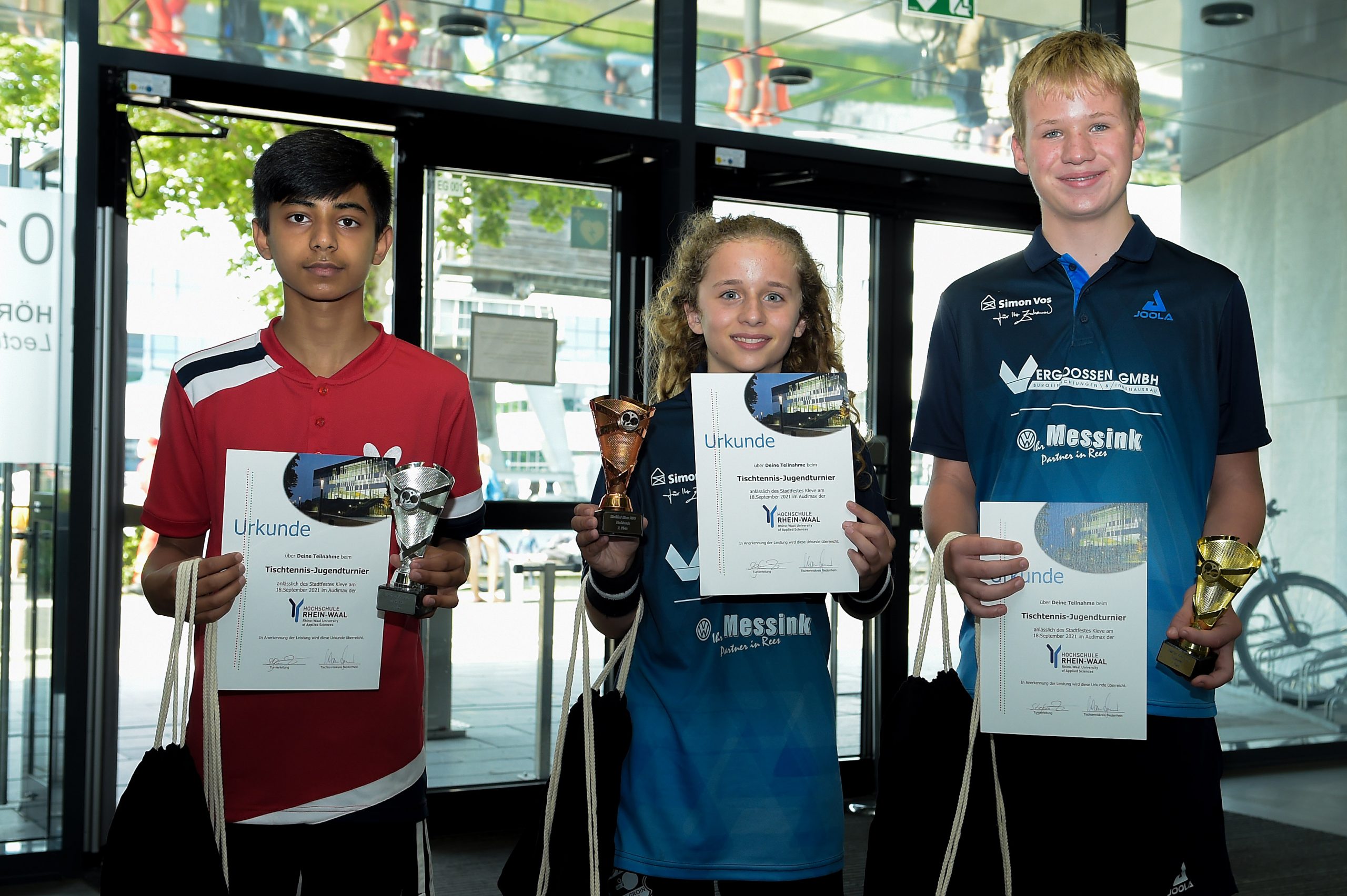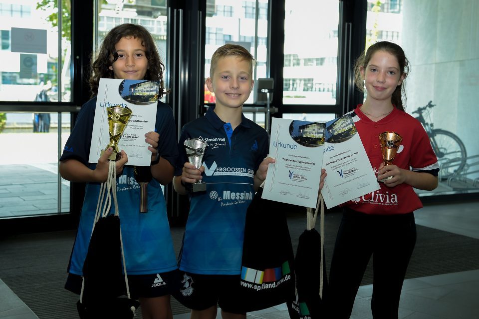 Bei der nun nachgeholten Veranstaltung in der Schwanenstadt Kleve wurden vornehmlich auf dem Campus der Hochschule Rhein-Waal mit Stand-Up-Paddling, Basketball und Tischtennis drei Sportangebote präsentiert. Der Tischtennis-Nachwuchs zeigte sich und sein Leistungsvermögen dabei an einem wahrlich ungewöhnlichen Ort: Im Hörsaalzentrum „Audimax“ auf dem Campus präsentierte der Nachwuchs des Tischtenniskreises Niederrhein, was er kann. Hier standen unter der bewährten Turnierleitung mit Stefan Irsen (Kreisvorsitzender Düsseldorf) und Petra Jenisch nach rund vier spiel- und kampfstarken Stunden die Sieger/innen fest, die mit Pokalen und Urkunden aus der Hand des KSB-Vorsitzenden Lutz Stermann und dem TT-Kreisvorsitzenden Niederrhein, Klaus Verburg, belohnt wurden.