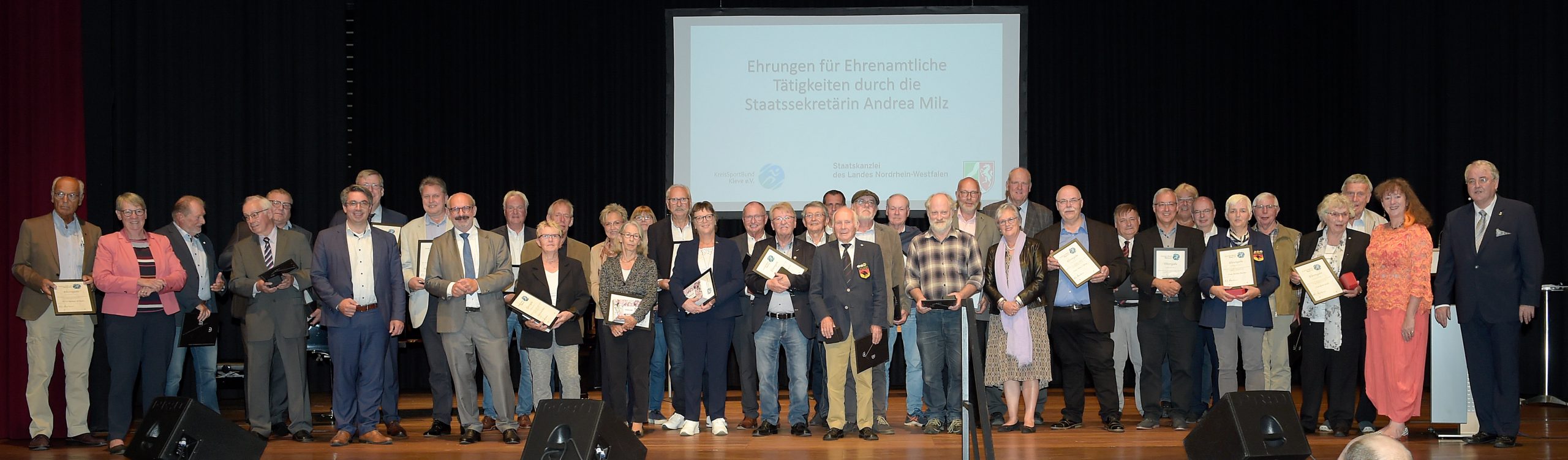 Doch damit war noch nicht Schluss: In der Klever Stadthalle fand am Abend eine Ehrungsveranstaltung der Staatskanzlei NRW statt, bei der langjährige und verdiente ehrenamtlich Mitarbeitende aus verschiedenen Sportarten von der Staatssekretärin für Sport und Ehrenamt, Andrea Milz, unter dem Beifall der Besucher ausgezeichnet wurden.