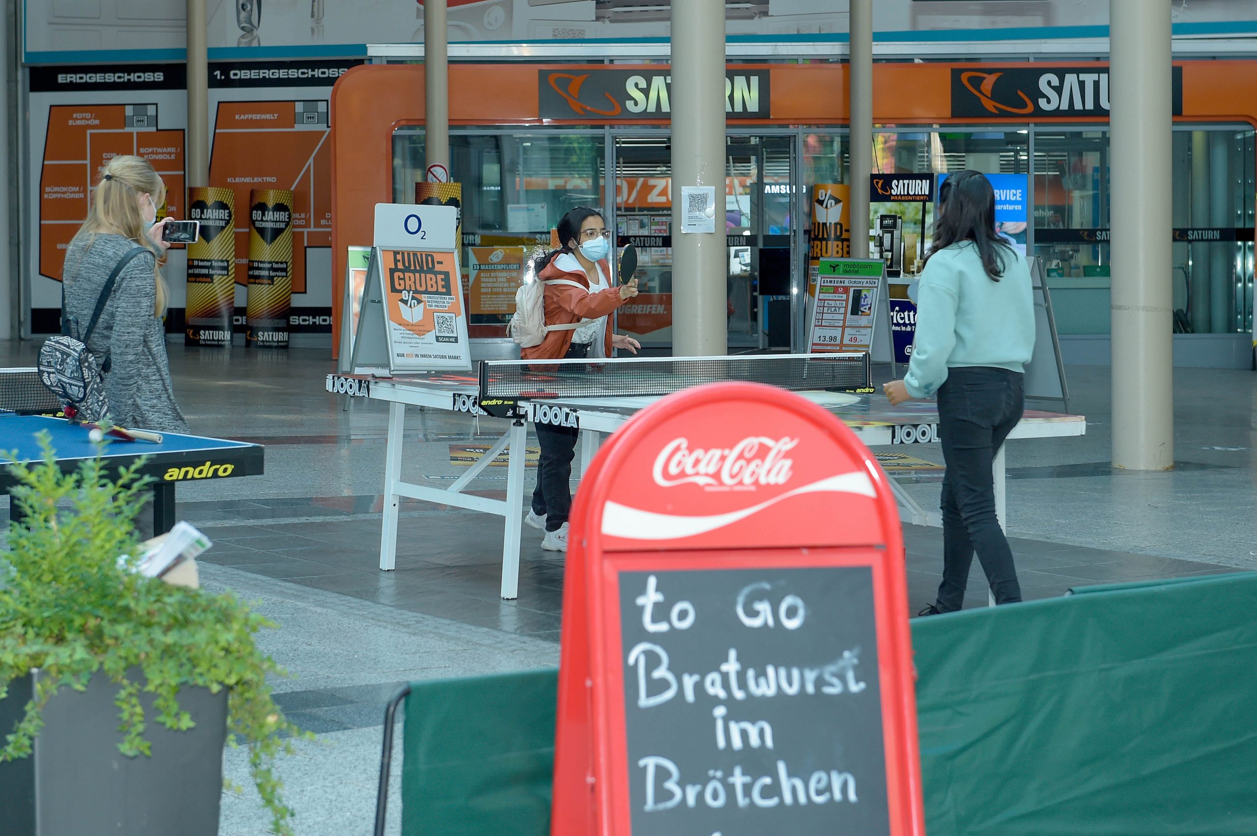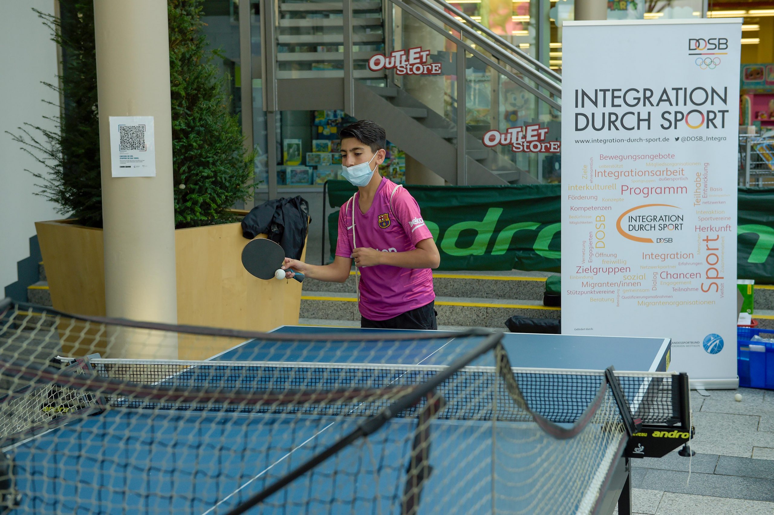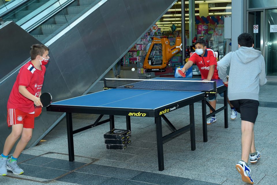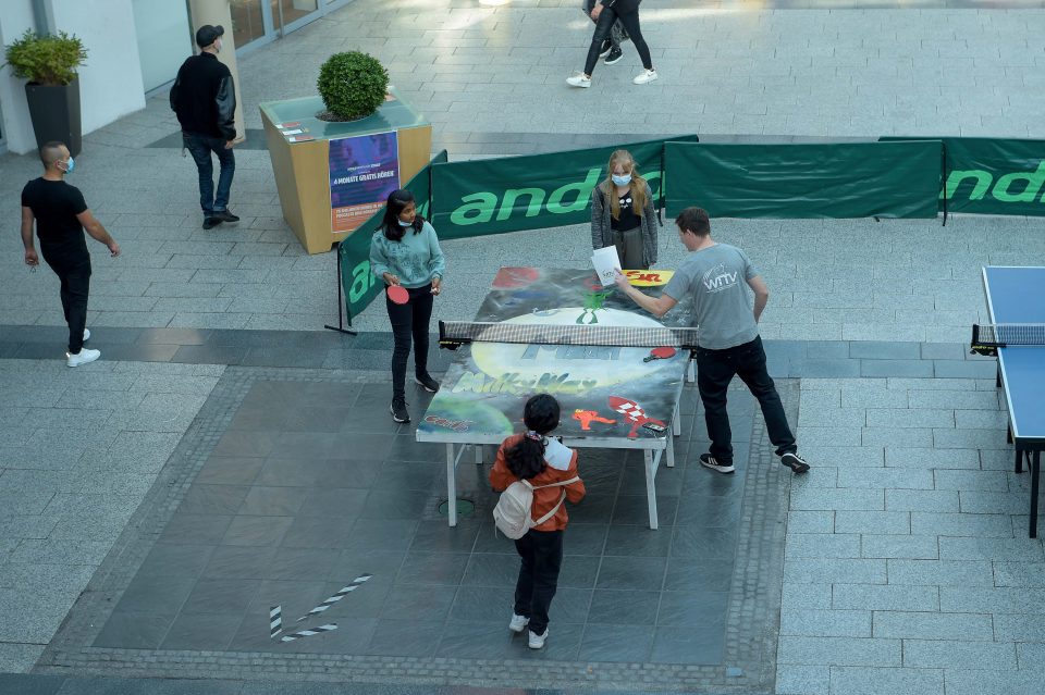 Unterdes informierte der WTTV die Besucher im Einkaufszentrum „Neue Mitte“ über unseren Sport. Neben Spielmöglichkeiten an kleinen und großen Tischen und einem Ballroboter gab es Antworten auf Fragen zum Programm „Integration durch Sport“