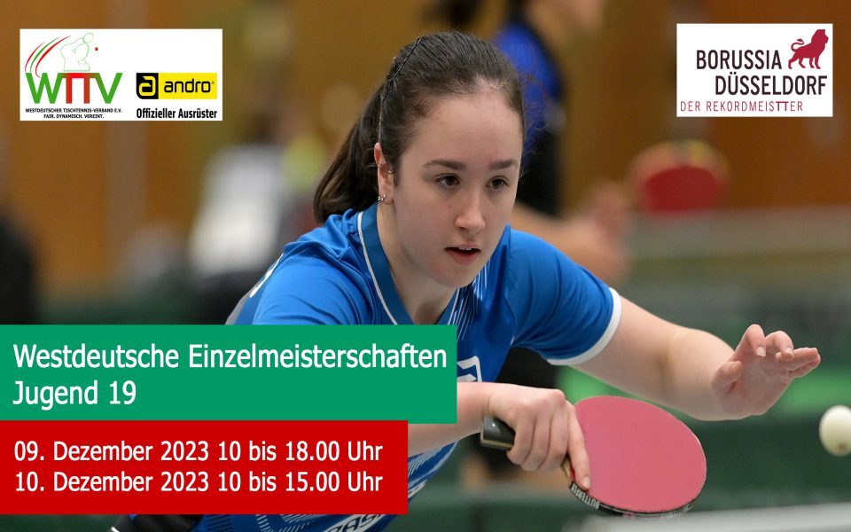 Am Wochenende werden in Düsseldorf die neuen Westdeutschen Meister der Jugend 19 gesucht. Gespielt wird jeweils ab 10 Uhr am 09. und 10. Dezember (ab Achtelfinale im Einzel, ab Viertelfinale im Doppel) im Deutschen Tischtenniszentrum (DTTZ) – ARAG Center-Court, Borussia-Düsseldorf-Str. 1 in 40629 Düsseldorf.