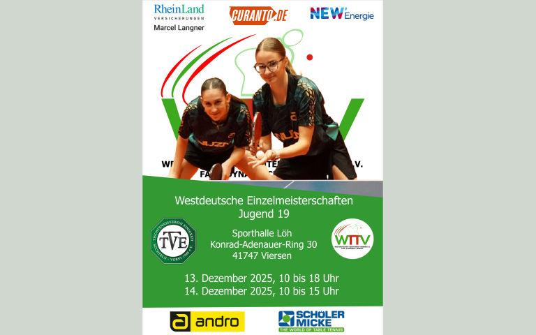 Die Einladung zu den Westdeutschen Meisterschaften der Jugend 19, die am 13./14. Dezember 2025 in Viersen stattfinden und von der TTV Einigkeit Süchteln-Vorst durchgeführt werden, ist nun veröffentlicht. Dazu zwei Hinweise: 1. Das PDF-Dokument „Gesamtfassung des Turnierantrags“ unter