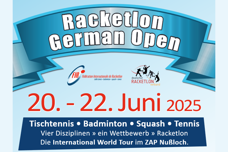 15. German Open im Racketlon in Nußloch Vom 20. bis 22. Juni 2025 ist es wieder so weit: Die German Open im Racketlon feiern ihr 15. Jubiläum! Austragungsort ist erneut